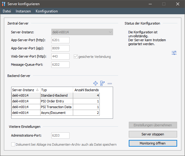 Sie können das Werkzeug über den Befehl <Server konfigurieren> im Windows-Startmenü starten. Dann steht Ihnen die folgende Konfigurations-Oberfläche zur Verfügung.