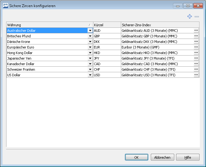 Bestätigen Sie Ihre Angaben mit "OK". Um Währung-Zins-Index-Paare zu entfernen, markieren Sie den Eintrag und wählen Sie dann das Icon "Ausgewähltes Währung-Zinsindex-Paar entfernen". Bestätigen Sie das Löschen mit "OK".