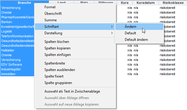 Alle häufig benötigten Funktionen für die Spalten einer Tabelle erreichen Sie über das Kontextmenü der Spalten(überschriften) oder die Icons und Befehle auf der Registerkarte "Tabelle" im Menüband.