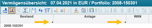 In diesem Bildbeispiel sind die Spalten "Bestand" und "Anlage" fixiert, die Spalte "WKN" nicht.
