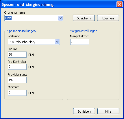 Die Parameter für die zu kalkulierenden Spesen und Margin-Forderungen (z. B. die Ihrer Bank) werden gesammelt in Form einer benannten "Ordnung" im Dialogfenster "Spesen- und Marginordnung" festgelegt.