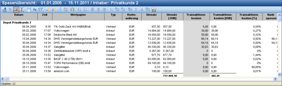 Umsatz [Auswertungswährung] | Der jeweilige Umsatz sowie für jedes Depot die zugehörige Summe in der Auswertungswährung. |