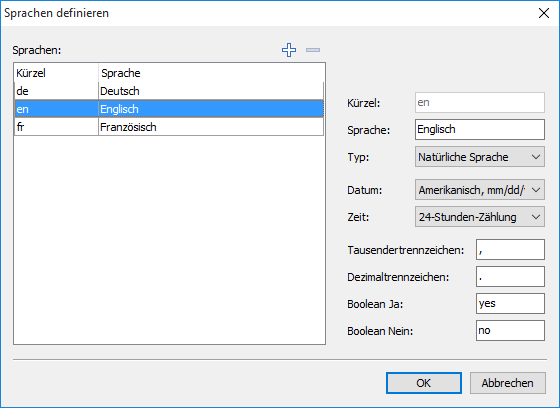 Typ | Wählen Sie in dieser Auswahlliste den Typ der Sprache – "Natürliche Sprache" oder "Ausgeblendet". Ausgeblendete Sprachen erscheinen nicht in den Auswahllisten für Sprachen im Programm wie z. B. in der Schnellzugriffsleiste oder der Reportingsprache in den Inhaber-Eigenschaften. |