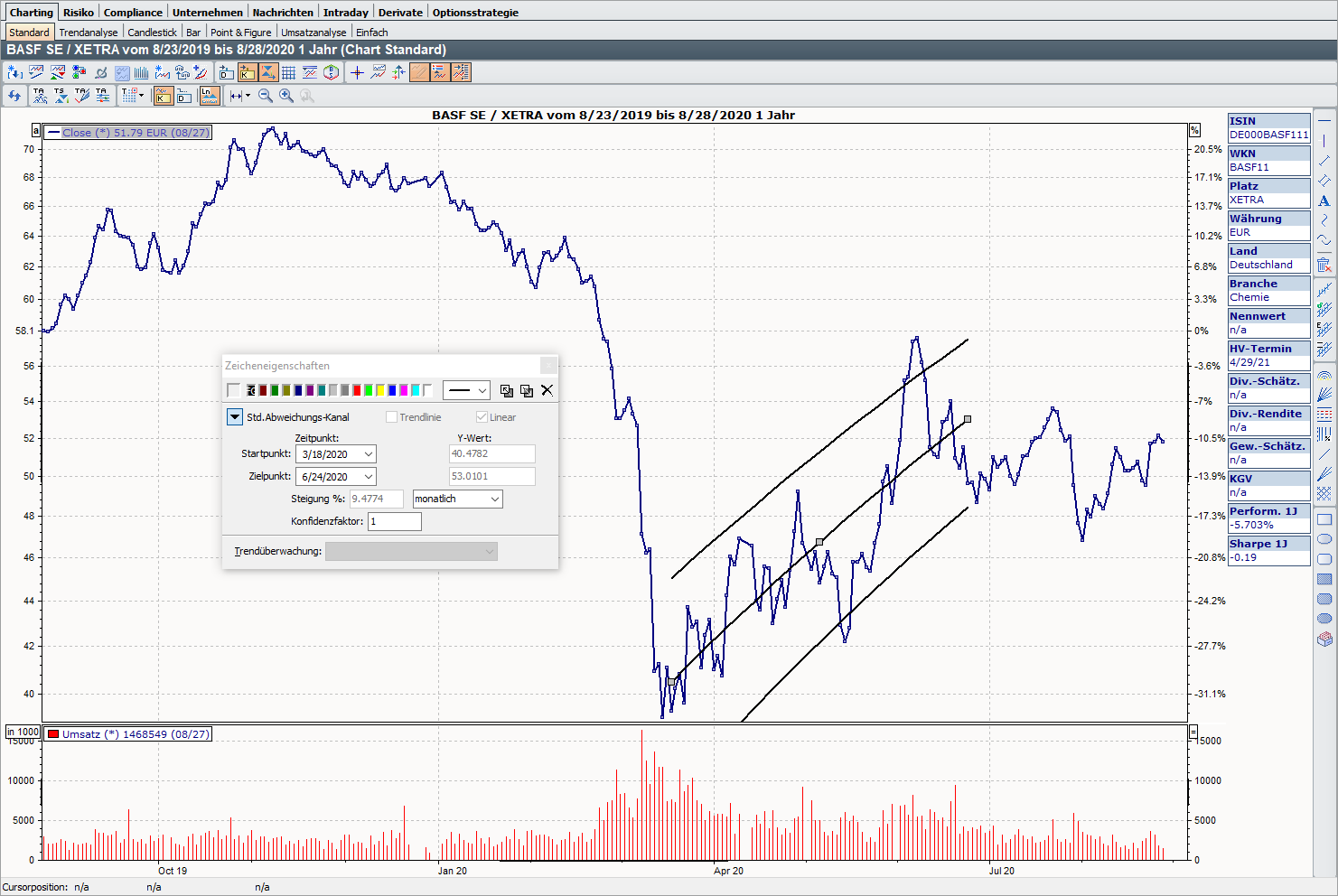 Im Dialogfenster "Zeicheneigenschaften" können Sie auch den genauen Start- und Zielpunkt eingeben. Außerdem sehen Sie hier die prozentuale Steigung im angezeigten Intervall (jährlich, monatlich oder täglich).