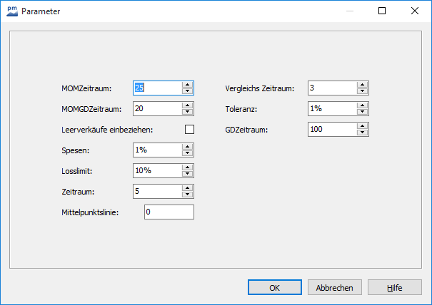Das Dialogfenster "Einstellungen" wird geöffnet, in dem Sie für alle verwendeten Variablen die Standardwerte setzen können. Die so von Ihnen festgelegten Defaults werden so lange für die Auswertungen verwendet, bis sie überschrieben werden (manuell in einer Auswertung oder automatisch, z. B. bei der Optimierung eines Handelssystems).