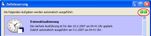 Rechtes Status-Icon | Läuft die Zeitsteuerung? Dieses rechte Status-Icon ist dann grün, wenn mindestens eine Aufgabe bereits konfiguriert ist. Die Zeitsteuerung wird erst angestoßen, wenn Sie das Dialogfenster "Zeitsteuerung" mit "OK" verlassen. Das rechte Status-Icon wechselt also die Farben nicht während des Einrichtens. |