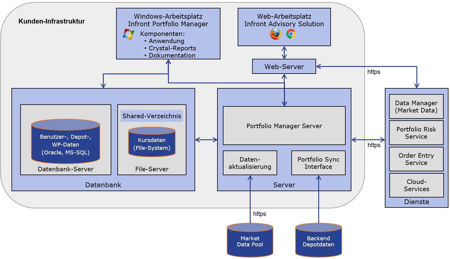 Das stellt die Verbindung zum Backend oder den depotführenden Banken her und importiert die Depotdaten. Wahlweise können zusätzliche zentrale Infront-Dienste wie z. B. der Order Entry Service verwendet werden.