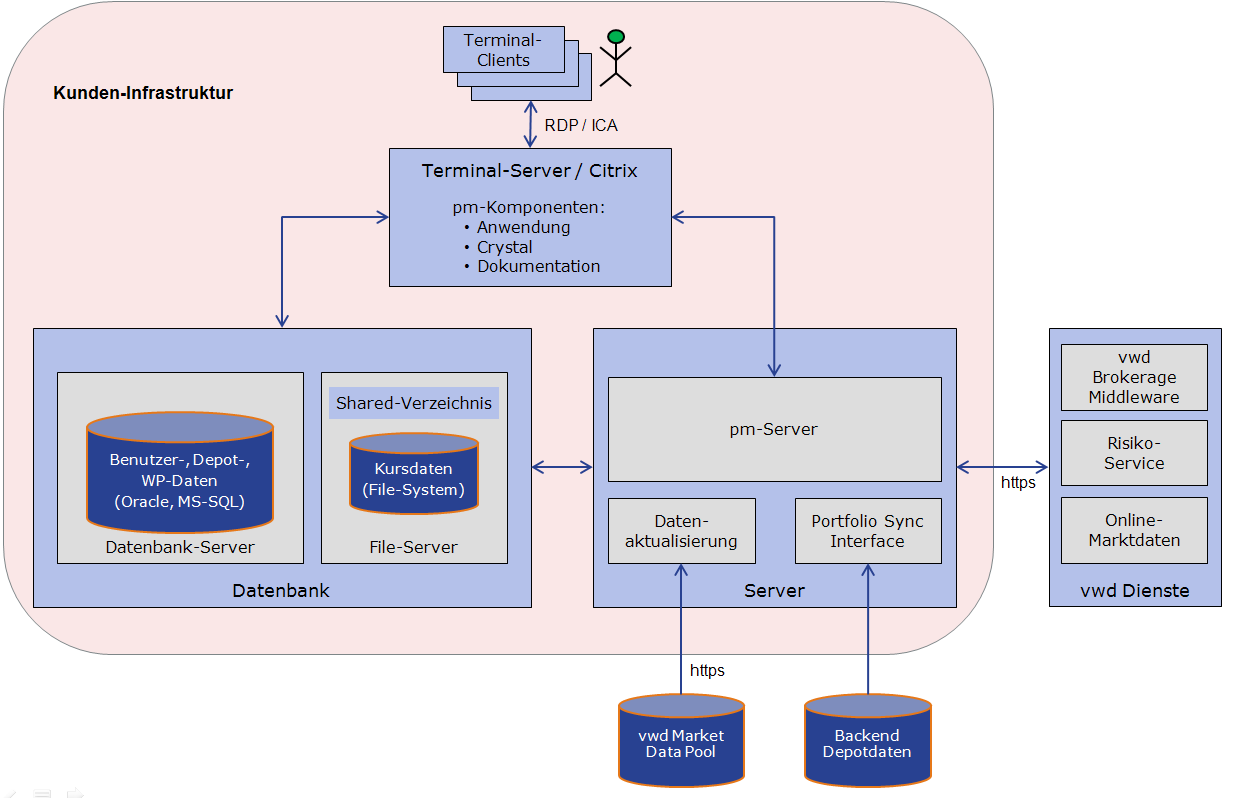 Zum Aufbau der Systemarchitektur beim Betrieb mit Terminal-Services können mehrere Architekturen zum Tragen kommen. Empfehlenswert ist eine Aufteilung der unterschiedlichen Aufgaben auf verschiedene Systeme wie nachfolgend abgebildet.