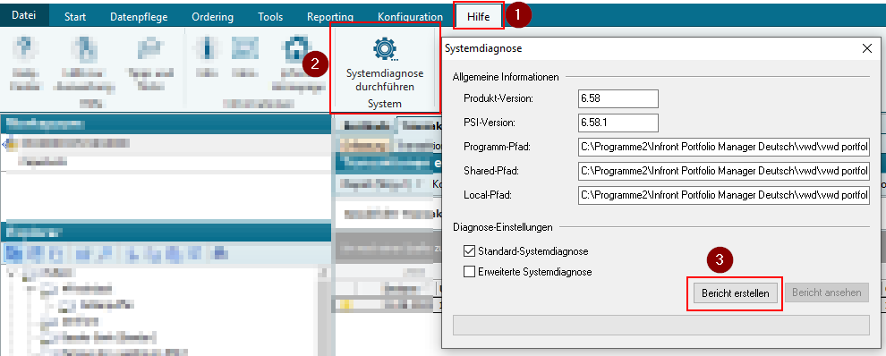 - Wählen Sie im Menüband Ihres Infront Portfolio Manager das Icon "Systemdiagnose durchführen" auf der Registerkarte "Hilfe".