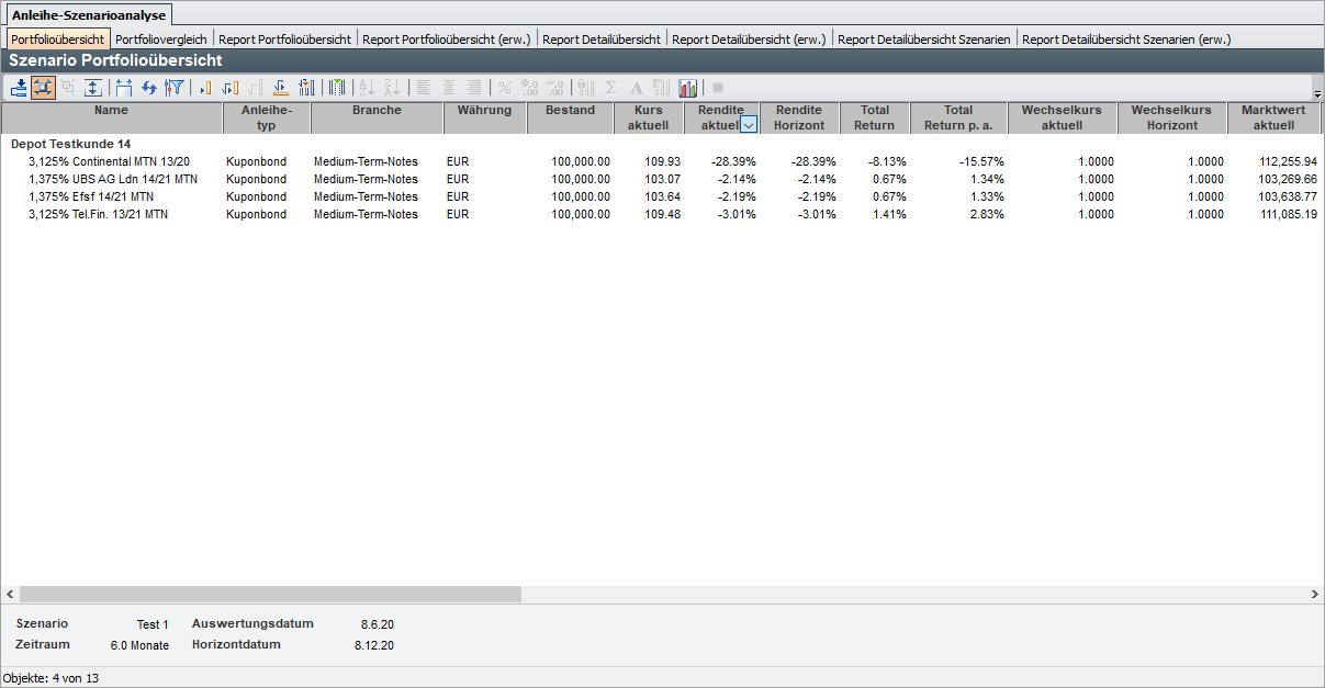 Mit der "Szenario Portfolioübersicht" haben Sie den perfekten Überblick über Ihr Anleihe-Portfolio. Alle Kennzahlen sind für alle Anleihen im Portfolio sowohl für das Auswertungsdatum ("Aktuell") als auch für das eingestellte Horizontdatum verfügbar.
