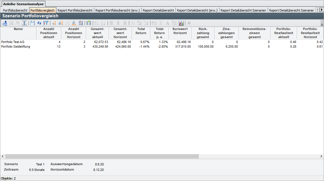 Mithilfe dieser Tabelle können Sie Portfoliovarianten des aktuellen Szenarios miteinander vergleichen und sehr schnell sehen, wie sich Änderungen in den Portfoliovarianten (z. B. An- oder Verkäufe) in den wichtigsten Kennzahlen niederschlagen. Alle Kennzahlen sind sowohl für das Auswertungsdatum ("aktuell") als auch für das eingestellte Horizontdatum verfügbar.