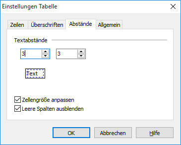 Auf dieser Registerkarte können Sie die Standardeinstellungen der Textabstände für das automatische Anpassen der Zellengröße bearbeiten. Die Details zu den einzelnen Optionen entnehmen Sie der folgenden Aufstellung: