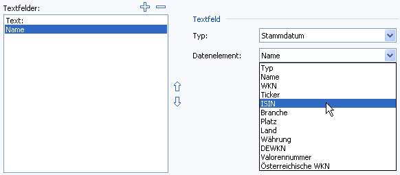 Eine Kursdaten-Export-Konfiguration wird aus einer Liste von Textfeldern zusammengesetzt, die in der aufgeführten Reihenfolge ausgegeben werden.