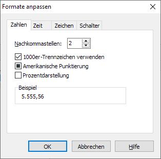 Formate für Zeitangaben | Wählen Sie das gewünschte Format für die Darstellung der Zeitangaben aus der Liste. |