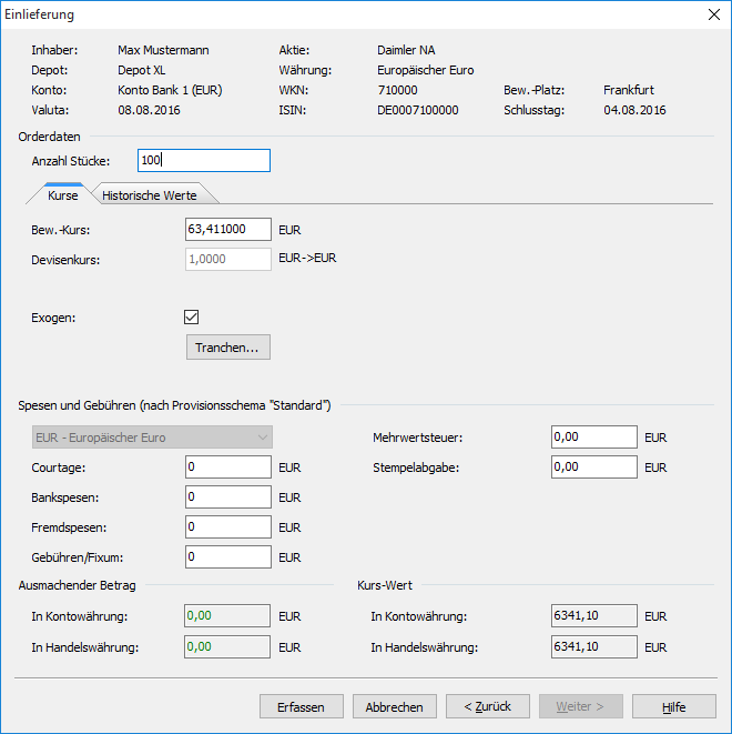 Bei der (exogenen) Einlieferung von Wertpapieren haben Sie daher die Möglichkeit, diese in einzelne Tranchen aufzuteilen, um eine exakte Abbildung der tatsächlichen Transaktionen zu erreichen. Gehen Sie dazu wie folgt vor: