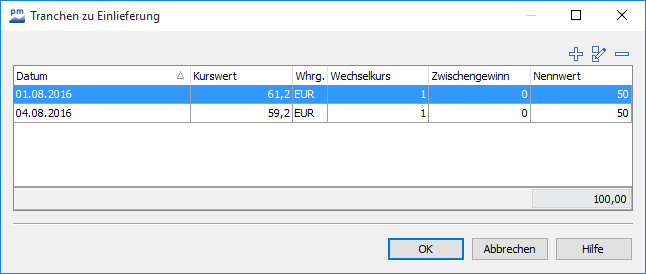 Legen Sie mithilfe des Icons "Neue Tranche anlegen" die gewünschten Tranchen an. Im erscheinenden Dialogfenster "Tranche-Eigenschaften" geben Sie Datum, Kurswert, Wechselkurs, Zwischengewinn (nur bei Fonds) und Nennwert der Tranche ein. Die Summe der Nennwerte der Tranchen wird immer unter der Spalte "Nennwert" eingeblendet.