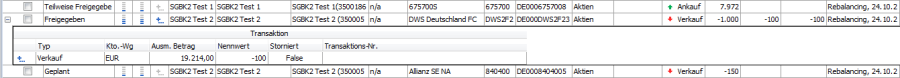 Unter den verknüpften Orders werden direkt die zugehörigen Transaktionen angezeigt. Im Transaktionsbereich werden zu den verknüpften Transaktionen folgende Informationen angezeigt: Typ (Verkauf, Kauf…), Kontowährung, Ausmachender Betrag, Nennwert, Storniert-Kennzeichen und Transaktionsnummer
