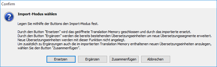 Durch den Button "Ersetzen" wird das geöffnete Translation Memory geschlossen und durch das importierte ersetzt.