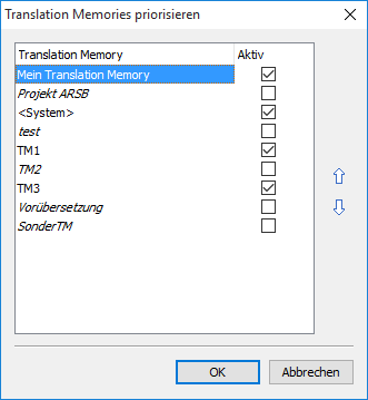 - Legen Sie dann im erscheinenden Dialogfenster "Translation Memories priorisieren" mithilfe der Pfeil-Icons auf der rechten Seite die Reihenfolge und damit die Priorisierung der verfügbaren Translation Memories fest.