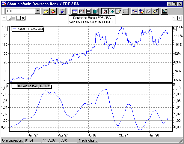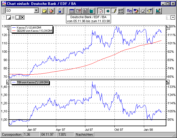 Am Schluss noch eine nicht unbedingt klassische Anwendungsmethode des TBI: Wenn Sie den zweiten GD auf den Wert 1 setzen, entspricht dieser GD dem Kursverlauf. So erreichen Sie, dass der TBI den Abstand zwischen dem ersten GD und dem Kursverlauf anzeigt. Da einige Analysten auch auf Übertreibungen, also zu "große" Abstände zwischen GD, insbesondere dem 200 Tage GD und dem Kursverlauf achten, kann dies durchaus interessant sein.