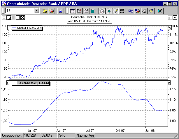 Das Basishandelssystem "Trendbestätigungsindikator (TBI)" ist standardmäßig sehr kurzfristig auf die beiden GD-Zeiträume 5 Tage/30 Tage eingestellt. Es liefert Kaufsignale, wenn der Indikator die Signallinie bei 100 von unten nach oben durchbricht, und Verkaufssignale, wenn der Indikator diese Linie von oben nach unten durchbricht.