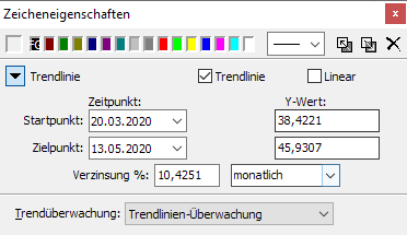Im Dialogfenster "Zeicheneigenschaften" können Sie den genauen Start- und Endzeitpunkt eingeben. Außerdem sehen Sie hier die prozentuale Steigung der Linie im gewählten Intervall (jährlich, monatlich oder täglich).