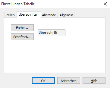 Um Farbe und Schriftart der Überschriften in der Tabelle zu ändern, wählen Sie den Befehl OPTIONEN… im Menü des Icons "Allgemeine Optionen" auf der Registerkarte "Tabelle". Sie gelangen in das Dialogfenster "Einstellungen Tabelle", in dem Sie verschiedene Grundeinstellungen bearbeiten können.