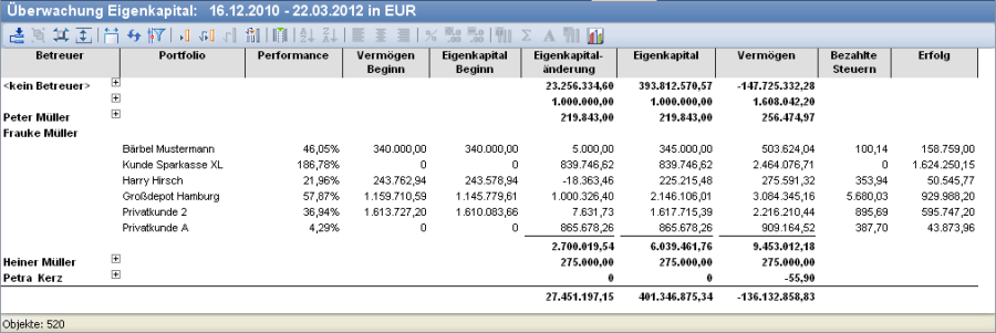 Diese nach Betreuern gruppierte Tabelle zeigt, welcher Betreuer im Auswertungszeitraum wie viel Eigenkapital verwaltet und akquiriert hat.