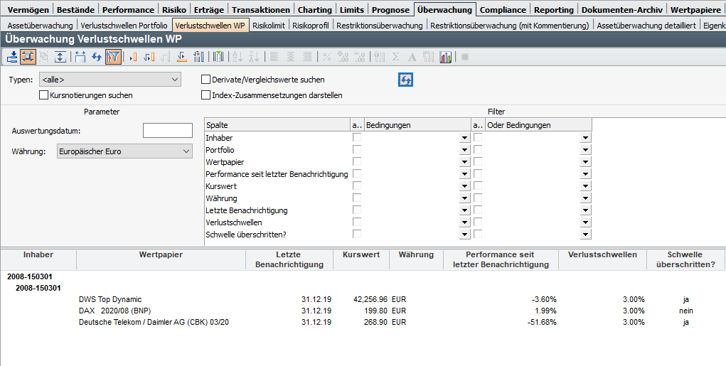 Schwelle überschritten? | Diese Spalte liefert den Wert "ja" für die Wertpapiere, die ihre Verlustschwelle im Benachrichtigungszeitraum überschritten haben, ansonsten "nein". |