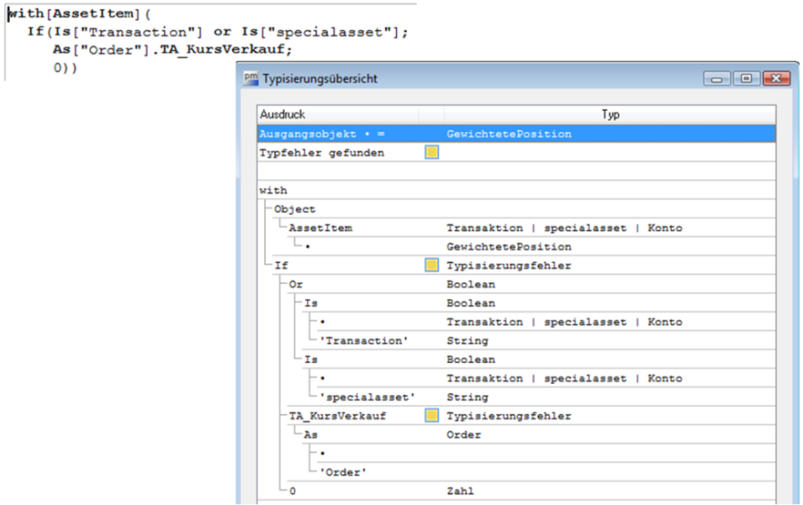 Die Übersicht zeigt alle Variablen und die für diese ermittelten Typen. Zudem wird in der Liste auch der Typ des Ausgangsobjekts der Formel angezeigt.
