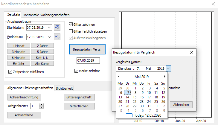 - Wählen Sie im nachfolgenden Dialogfenster für das Vergleichsdatum ein festes Datum oder lassen Sie das Datum relativ zum ersten Datum der Zeitachse darstellen.