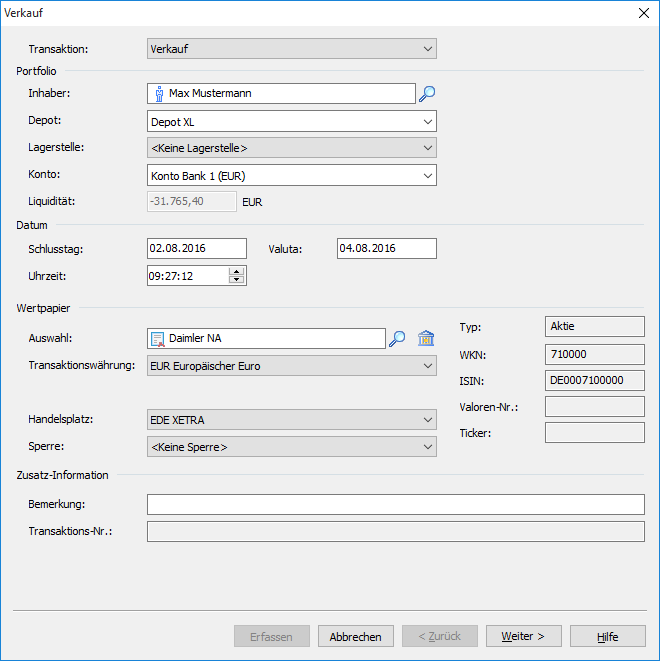 Es erscheint die zweite Seite, auf der Sie analog zu einem Ankauf die weiteren Angaben zur Verkaufstransaktion machen.