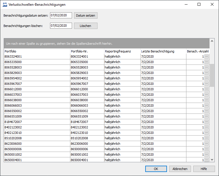 Darunter sehen Sie eine Tabelle mit allen Portfolios, deren Portfolionummern sowie deren Reportingfrequenz. In der Spalte "Letzte Benachrichtigung" sehen Sie für jedes Portfolio das Datum der letzten (nicht gelöschten) Benachrichtigung. Führen Sie ein Verlustschwellen-Reporting (z. B. über einen Job) durch, so wird dieses Datum automatisch gesetzt. Sie können dieses Datum aber auch bei Bedarf wie beschrieben manuell editieren.