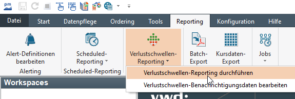 Haben Sie Portfolios über eine Portfolio-Version in den Portfolio-Eigenschaften oder über ein Portfolio-Profil Verlustschwellen zugewiesen und überwachen Sie diese, dann organisieren Sie die Ausführung des Reportings bezüglich dieser Verlustschwellen mit der Funktion "Verlustschwellen-Reporting". Gehen Sie dazu wie folgt vor: