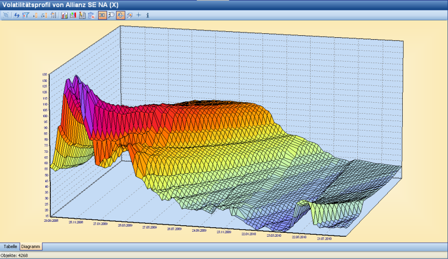 Das Volatilitätsprofil stellt die Volatilitäten eines Wertpapiers (z. B. einer Aktie oder eines Optionsscheins) im Zeitverlauf in einem 3-D-Diagramm optisch ansprechend dar. Der zugehörigen Tabelle entnehmen Sie übersichtlich die exakten Werte.