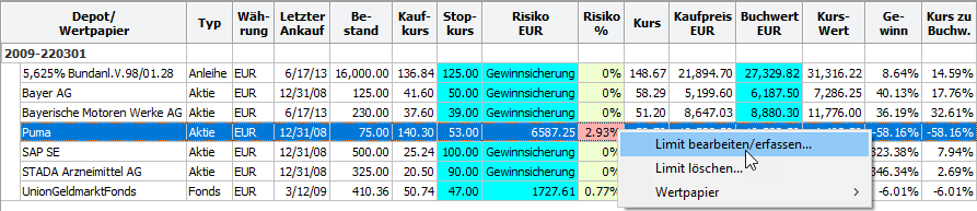 Anhand Ihrer Eingaben wird die Anzeige der Kapitalübersicht aktualisiert. - Klicken Sie mit der rechten Maustaste auf ein Wertpapier in der Vermögensübersicht.