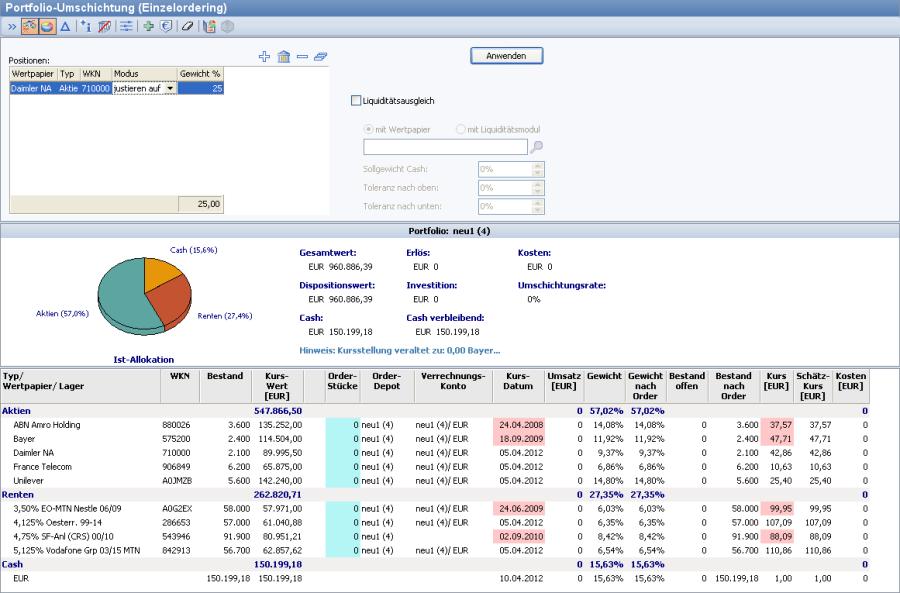 Blenden Sie sich die Parameteransicht (<STRG>+<B>) ein, um z. B. die Portfolio-Umschichtungen nach Wertpapier-Soll-Gewichten anzuwenden.