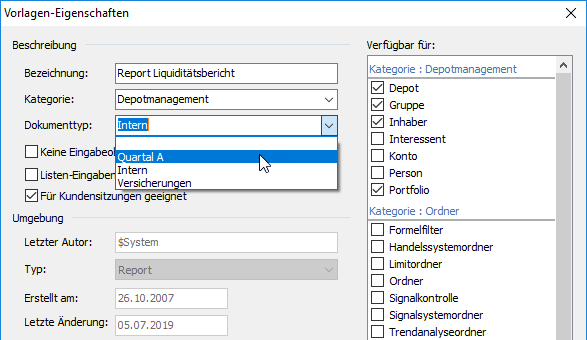 Den Dokumenttyp aus der zuvor beschriebenen Konfiguration der Dokumenttypen können Sie dann einer Vorlage in deren Eigenschaften zuweisen, so dass die mit dieser Vorlage erzeugten Reports für freigeschaltete Personen auch automatisch hochgeladen werden können.