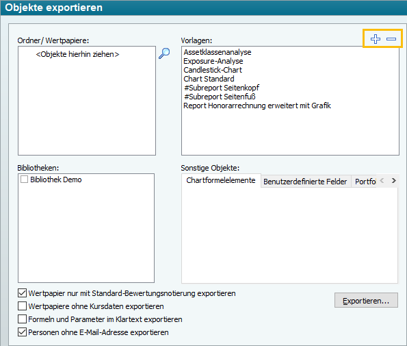 Mit dem Infront Portfolio Manager können Sie Datenbankobjekte exportieren bzw. importieren. Das gilt auch für die Vorlagen.