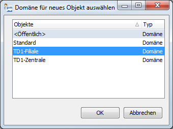 Da jede Zone einer Domäne zugeordnet sein muss, müssen Sie direkt beim Anlegen der Zone eine Domäne mithilfe des erscheinenden Dialogfensters "Domäne für neues Objekt auswählen" markieren und mit "OK" bestätigen.