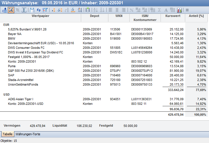 Sie finden die Währungsanalyse z. B. im Workspace von Inhabern oder Portfolios auf dem Worksheet "Vermögen".
