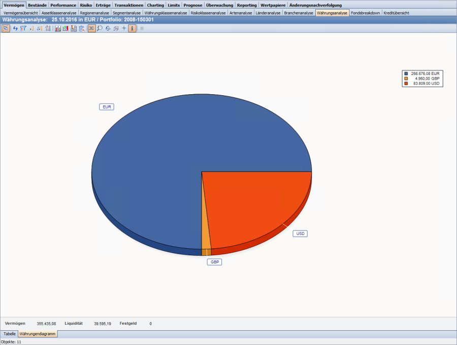 Das Tortendiagramm zeigt den Wertanteil der einzelnen Depotpositionen gruppiert nach Währungen sowie den Anteil der Liquidität am Vermögen. Auch hier fließen ggf. vorhandene Kredite mit negativen Werten ein.