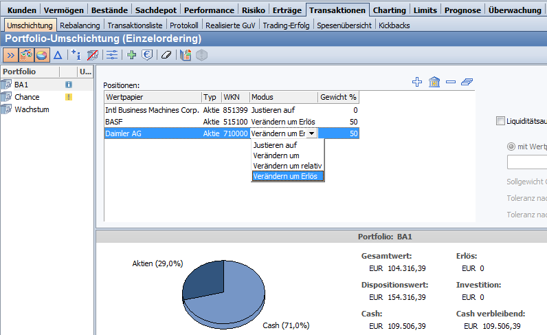 Verändern um Erlös x% | Soll-Gewicht = Ist-Gewicht + Erlös * x% Der "Erlös" ist die Summe der Verkaufs-Gewichte aus allen anderen Instrumenten. Ein Anteil von x% wird der entsprechenden Position zugeschlagen. | |