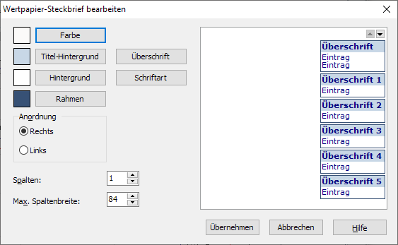 Zum Bearbeiten des Wertpapier-Steckbriefs wählen Sie auf der Registerkarte "Chart" im Menü des Icons "Chartelemente bearbeiten" den Befehl WERTPAPIER-STECKBRIEF. Sie gelangen in das Dialogfenster "Wertpapier-Steckbrief bearbeiten".