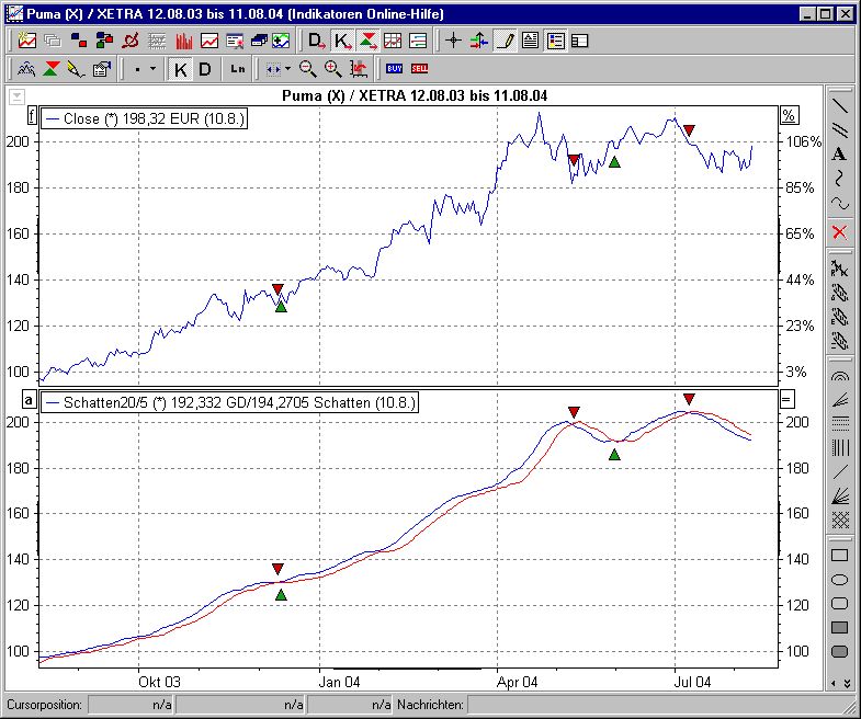 Das Basishandelssystem "Williams Schattenlinien" ist mit folgenden Einstellungen angelegt: Zeitraum 20 Tage für den linearen GD, Schatten bei 5. Es liefert Kaufsignale, wenn der GD seine Schattenlinie von unten nach oben durchbricht, und Verkaufssignale, wenn der GD seinen Schatten von oben nach unten schneidet.