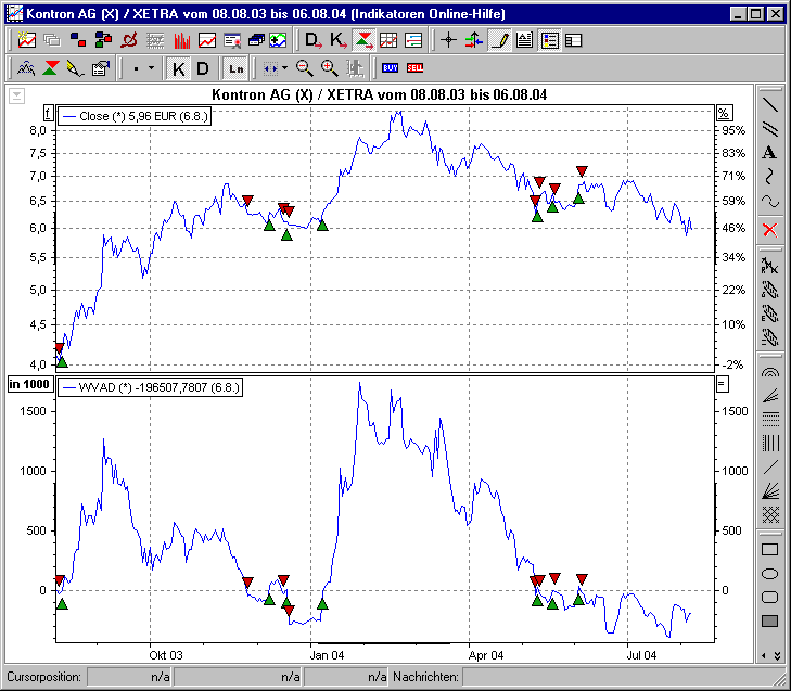 Wie bei anderen Oszillatoren kann auch das Verlassen von Extremzonen als Signalgeber benutzt werden. Problematisch ist allerdings, dass der WVAD keine festen Grenzen hat, von daher müssen Sie selbst die Extremzonen festlegen, wozu einige Erfahrung notwendig ist! Das Verlassen des oberen Extrembereichs ist ein Verkaufssignal, das Verlassen des unteren Extrembereichs ein Kaufsignal.