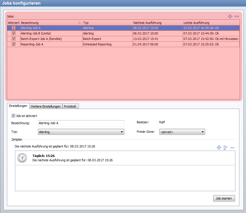 Die Übersicht oben im Worksheet "Jobs konfigurieren" stellt alle derzeit eingerichteten Jobs dar. Hier sind folgende Basisinformationen einzusehen:
