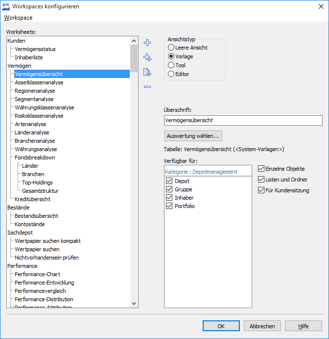 Zum Bearbeiten der Workspaces und Worksheets wählen Sie auf der Registerkarte "Konfiguration" im Menü des Icons "Workspaces" den Befehl WORKSPACES KONFIGURIEREN.