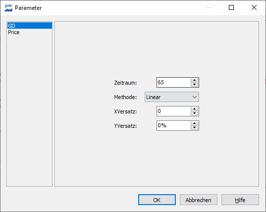 Nachfolgend finden Sie ist ein typisches Parameter-Dialogfenster für GD und Price. Die Dialogfenster für die anderen Indikatoren sind ähnlich aufgebaut; die Bezeichnungen der Parameter passen sich den jeweiligen Indikatoren an.