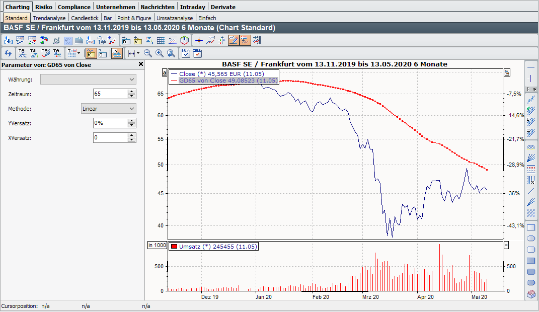 Die Parameter und Grundeinstellungen für die verschiedenen Indikatoren entnehmen Sie dem Kapitel zu den Indikatoren. Dort sind alle Indikatoren aus dem Infront Portfolio Manager ausführlich beschrieben, einschließlich der Berechnung und der Standardeinstellungen.